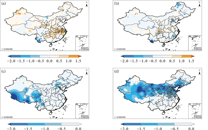 图 9 1961年以来中国春节假期(a)降水日数, (b)雾日数, (c)大风日数和(d)寒冷日数的变化趋势空间分布(单位:d/10 a) Fig. 9 Spatial distribution of trends of (a) rainy days, (b) foggy days, (c) windy days and (d) cold days during the Spring Festival holiday since 1961 in China (unit: d/10 a) |