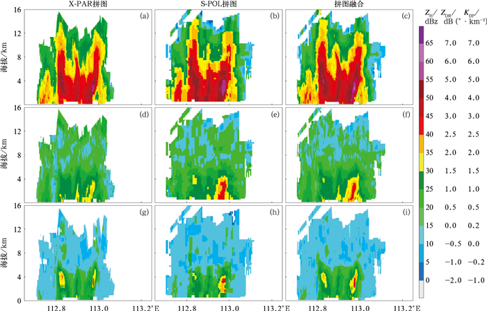 2.2 单波长雷达网拼图方法针对不同波长雷达探测特性,首先对单一波长雷达网进行拼图。其中X-PAR拼图的水平空间分辨率为50 m,S-POL拼图的水平空间分辨率为500 m,两组拼图的垂直分辨率均设置为200 m。拼图的雷达物理量包括ZH、ZDR、KDP,其中ZH在拼图时的单位由dBz转换为mm6·m-3后进行插值(Warren and Protat, 2019)。