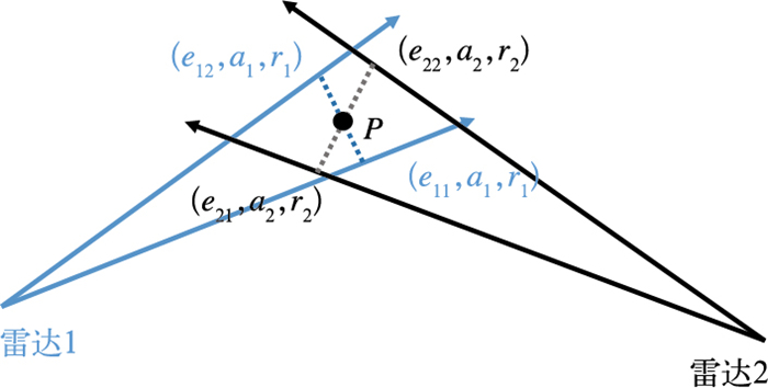图 4 两部雷达对目标点P的匹配点示意图 注:射线代表雷达相邻两层仰角的径向。 Fig. 4 Schematic diagram of matching points of two radars to the target point P |