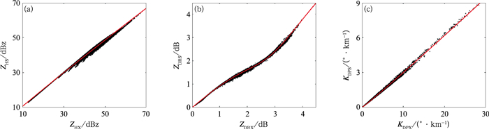图 5 X波段向S波段雷达物理量转换的拟合关系(a)ZH,(b)ZDR,(c)KDP Fig. 5 Scatter plots of the conversion from X-band to S-band (a) ZH, (b) ZDR, (c) KDP |