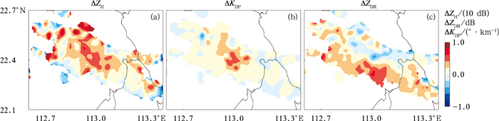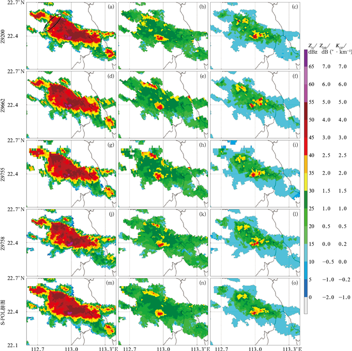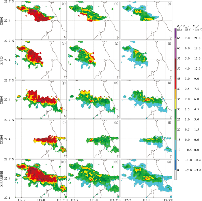 1 数据概况 1.1 雷达参数本研究选用广东省S波段双偏振天气雷达(S-POL)和X波段双偏振相控阵天气雷达(X-PAR) 资料为主要研究数据。其中S-POL的数据经过了严格的标定,数据质量相对稳定可靠。X-PAR是一款全固态相参、有源相控阵、脉冲多普勒、双偏振天气雷达。S-POL与X-PAR均包含反射率因子ZH(单位:dBz)、零滞后相关系数ρHV、差分反射率因子ZDR(单位:dB)、双程差分传播相移ΦDP(单位:°)、差分传播相移率KDP(单位:°·km-1)的三维体扫数据。