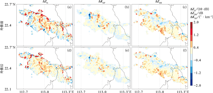 图 8 2022年5月11日07:12广东省一次对流天气4 km高度S-POL拼图外推前(a)ZH, (b)KDP, (c)ZDR与外推后(d)ZH, (e)KDP, (f)ZDR的粗糙偏差 Fig. 8 Low-resolution deviation of (a, d) ZH, (b, e) KDP, (c, f) ZDR, and (a-c) before and (d-f) after S-POL radar mosaic extrapolation at 4 km altitude for a severe convective weather system in Guangdong Province at 07:12 UTC 11 May 2022 |