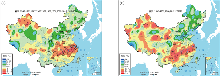 图 10 (a) 所有相似年和(b)PDO负位相背景下的相似年与2025年ENSO演变相似年份的夏季降水量距平百分率合成 注:+表示通过0.05显著性水平检验。 Fig. 10 Composition of the summer precipitation anomaly percentage in (a) all analogous years and (b) analogous years under the PDO negative phase with the ENSO evolution in 2025 |