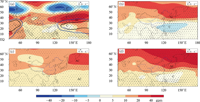 图 4 2025年夏季500 hPa位势高度(等值线,单位:gpm)及其距平场(填色)和850 hPa风场距平(风矢)(a)观测,(b)CMA-CPS v3,(c)ECMWF-S5,(d)NCEP-CFS v2 注:图a中5880 gpm等值线表示副高,蓝色表示2025年,黑色表示气候平均;AC和C分别表示反气旋和气旋环流异常。 Fig. 4 Geopotential height (contour, unit: gpm) and its anomaly field (colored) at 500 hPa, and wind anomalies (vector) at 850 hPa in summer of 2025 (a) observation, (b) CMA-CPS v3, (c) ECMWF-S5, (d) NCEP-CFS v2 |