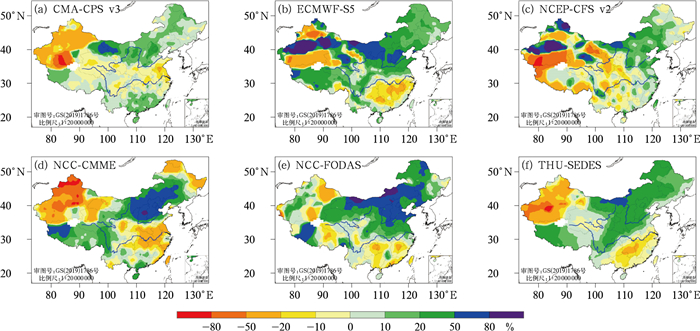 图 5 六种客观方法2025年3月起报的2025年夏季降水量距平百分率分布 Fig. 5 Predicted summer precipitation anomaly percentage in 2025 by six objective methods initialized in March 2025 |