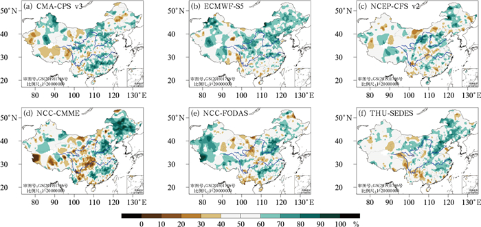 由此可见,客观方法在多方面存在较大分歧,给2025年汛期预测带来较大的不确定性。因此,需结合各方法的预测技巧,提取确定性较大的预测信息。图 6给出了六种客观方法在2015—2024年3月起报的当年夏季降水量距平同号率的空间分布,六种方法在华北、东北、江南地区的同号率总体在60%以上,其中NCC-CMME(图 6d)在上述地区的技巧明显优于其他方法,而大部分方法在西南地区东部和南部、青藏高原东部、华南南部等地的预测技巧较低。