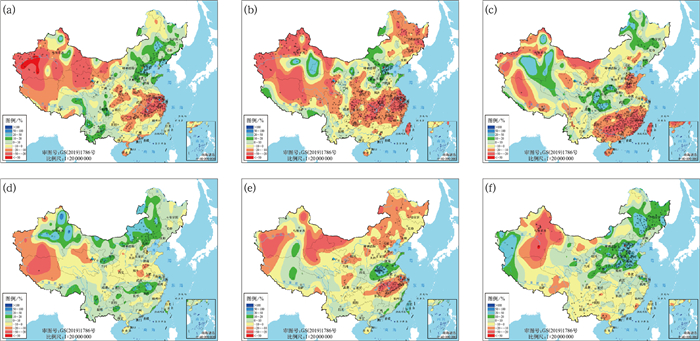 图 7 中国夏季降水量距平百分率的年代际合成(a)1960—1969年,(b)1970—1979年,(c)1980—1989年,(d)1990—1999年,(e)2000—2009年,(f)2016—2024年 注:+表示通过0.05显著性水平检验。 Fig. 7 Interdecadal composition of summer precipitation anomaly percentage in China (a) 1960-1969, (b) 1970-1979, (c) 1980-1989, (d) 1990-1999, (e) 2000-2009, (f) 2016-2024 |
