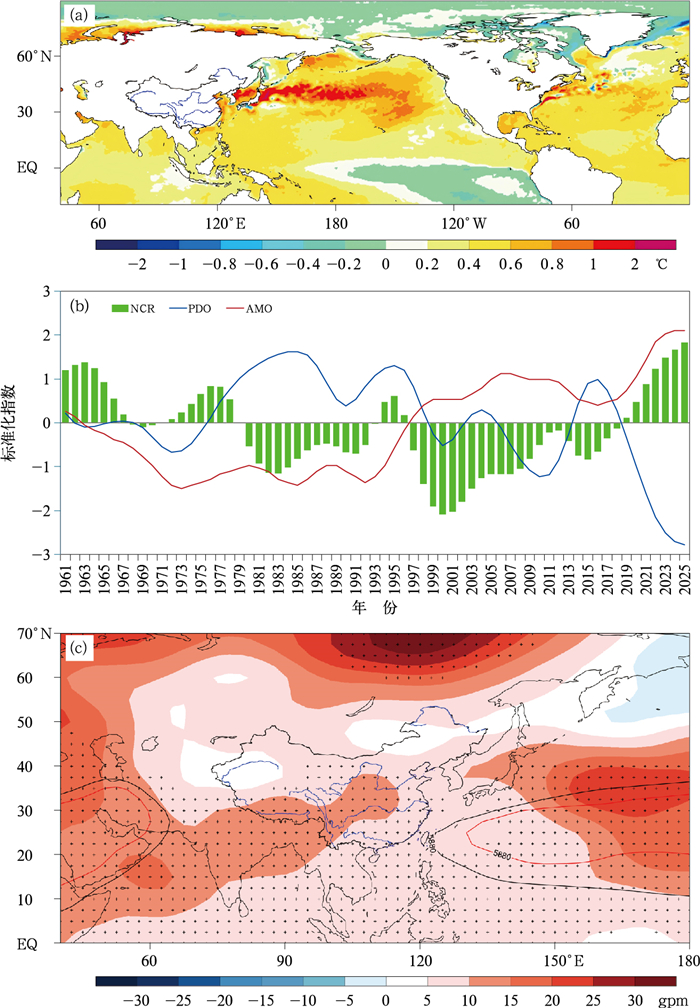监测显示,2017年PDO指数由正转负,并持续至2025年3月;20世纪末AMO指数由负转正。由2017年1月至2025年3月海温距平场(图 8a)可见,北太平洋海温大范围偏高,西风漂流带偏高0.8℃以上,而东南太平洋海温偏低;北大西洋全区海温偏高,0~40°N大范围偏高0.4℃以上。PDO目前处于1961年以来最强的冷位相时期,而AMO则处于20世纪以来最强的暖位相时期(图 8b)。从华北(36°~42°N、108°~125°E)夏季降水量(NCR)、年平均的PDO指数和AMO指数的年代际分量演变(图 8b)清晰可见,2017年以来,随着PDO位相由暖转冷、AMO暖位相持续增强,华北降水转入年代际偏多。由2017—2024年夏季500 hPa位势高度距平可见,这一时期,副高偏强、偏西、北界偏北,日本岛及其以东为较强正位势高度距平(图 8c),有利于小笠原高压和东亚夏季风偏强。因此,PDO和AMO是2025年汛期降水预测年代际尺度的主导信号,有利于主雨带持续位于中国北方地区。
