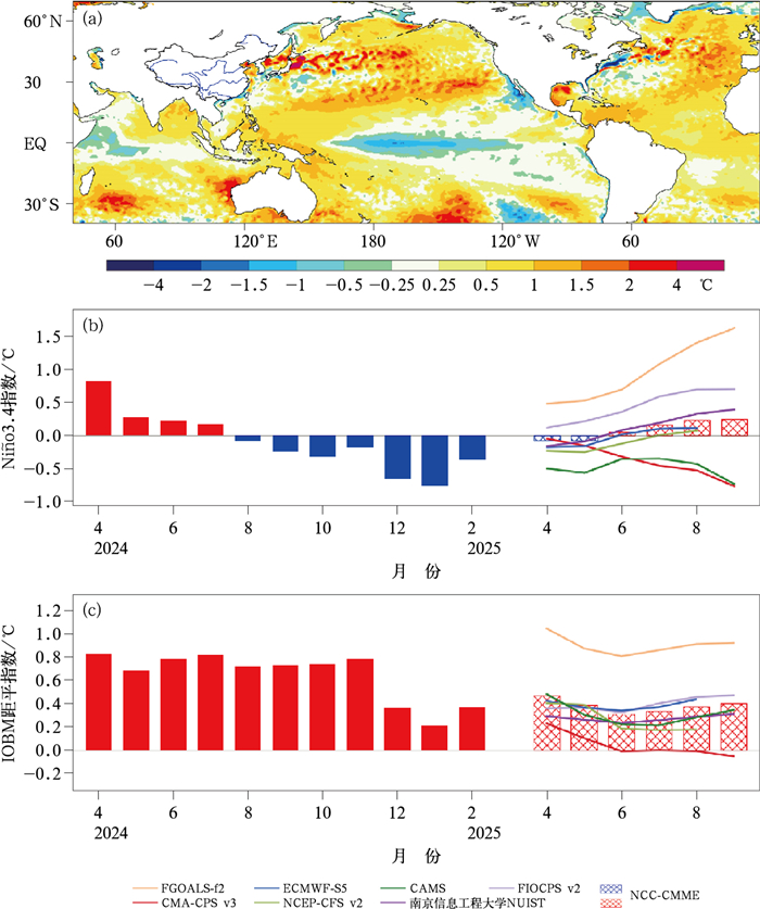 图 9 (a) 2025年前冬海温距平以及(b,c)2024年4月至2025年2月逐月实况指数(填色柱形)和2025年3月起报的4—9月(b)Niño3.4指数和(c)IOBM距平指数 Fig. 9 (a) Sea surface temperature anomaly in pre-winter of 2025, and (b, c) monthly observation indices (colored bar) from April 2024 to February 2025 and prediction initialized in March 2025 for (b) Niño3.4 index and (c) IOBM anomaly index from April to September |