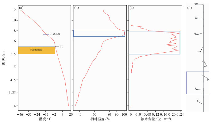 图 10为此次对流云降水发生前(2022年6月26日20:00)MOR的微波辐射计和探空站观测的温度、相对湿度、云中液水含量和水平风的垂直廓线,以及云底高度。由图可见,降水发生前:温度随海拔增加减小,云底高度在海拔约7.5 km,0℃等温线在海拔约5.8 km, 相对地面高度约1.5 km(图 10a),显著低于云底高度;相对湿度的极值区出现在海拔约6.7~8.2 km的对流层中高层(图 10b);在海拔约5.7~7.6 km的对流层中底层,存在多个液水含量极值区(图 10c),均>0.2 g·m-3;在海拔约4.5~5.0 km的近地面有一明显的水平风垂直切变(图 10d),风向由底部的西风陡然转为顶部的东南风,而在海拔8.5 km以上的对流层高层,为一致的强西风气流。图 9中对流云单体移向为自西向东,与图 10d中对流云高层的偏西风一致,这与图 5统计发现的结果一致,说明MOR对流单体移向由对流层高层的环境风场决定。