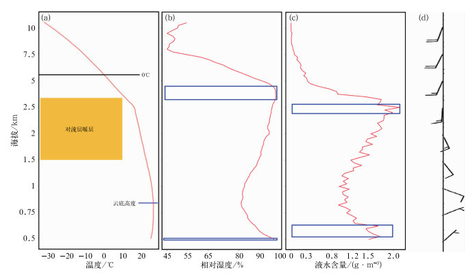 注:图b~d中蓝色方框分别示意相对湿度、液水含量极值区和水平风垂直切变区。 (a)温度,(b)相对湿度,(c)液水含量,(d)水平风 Fig. 10 Vertical profiles of (a) temperature, (b) relative humidity, (c) liquid water content and (d) horizontal wind measured by (a-c) microwave radiometer and (d) radiosonde in MOR at 20:00 BT 26 June 2022 |