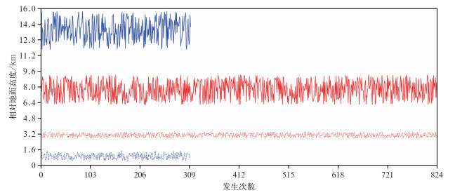 图 3 2019—2024年MOR(红色)和成都地区(蓝色)夏季深对流系统降水发生次数及其对应的云底(虚线)、云顶(实线)高度 Fig. 3 Frequency of precipitation events under deep convection systems in summer and their corresponding cloud base (dashed line) and cloud top (solid line) heights in MOR (red) and Chengdu (blue) from 2019 to 2024 |