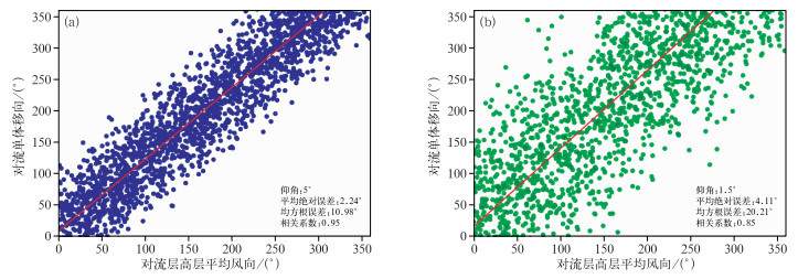此外,在上述深对流系统降水观测样本数据集基础上,选取不同时间间隔的ZH观测数据(MOR:2400次,5°仰角;成都地区:1950次,1.5°仰角),以及所对应时刻的探空风场数据开展相关性统计分析(图 5)。由图可见,两个地区对流层高层平均风向与强对流单体移向均呈高度线性正相关(图中红线)。MOR样本数据的平均绝对误差和均方根误差均低于成都地区,相关系数高于成都地区。