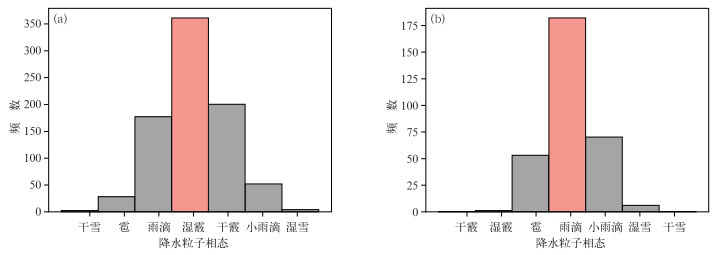 图 6 2019—2024年(a)MOR和(b)成都地区夏季深对流系统在边界层各类降水粒子相态发生频数 Fig. 6 Distribution of the occurrence frequency of various precipitation particle phases in the boundary layer of deep convection system in summer in (a) MOR and (b) Chengdu from 2019 to 2024 |