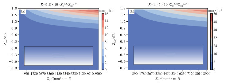图 7 (a) MOR和(b)成都地区双偏振雷达估测对流云降水的R(ZH, ZDR)关系 注:方框示意定量估测降水误差较大。 Fig. 7 The R(ZH, ZDR) relationships of quantitative convective cloud precipitation estimation by the dual-polarization radars in (a) MOR and (b) Chengdu |