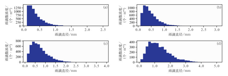 图 8 (a,b)MOR和(c,d)成都地区对流云降水在地面的雨滴谱实况观测 (a)2021年6月27日17:14,雨强:10.7 mm·h-1,(b)2023年7月4日13:37,雨强:19.3 mm·h-1,(c)2022年7月17日20:42,雨强:27.6 mm·h-1,(d)2024年6月23日03:23,雨强:48.9 mm·h-1 Fig. 8 Observed raindrop size distribution of convective cloud precipitation on the surface in (a, b) MOR and (c, d) Chengdu at (a) 17:14 BT 27 June 2021 with rain rate 10.7 mm·h-1, (b) 13:37 BT 4 July 2023 with rain rate 19.3 mm·h-1, (c) 20:42 BT 17 July 2022 with rain rate 27.6 mm·h-1 and (d) 03:23 BT 23 June 2024 with rain rate 48.9 mm·h-1 |