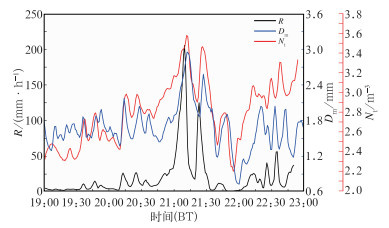 图 11 2023年7月12日19:00—23:00费县站雨滴谱特征时序变化 Fig. 11 Time-series of raindrop spectrum characteristics at Feixian Station from 19:00 BT to 23:00 BT 12 July 2023 |