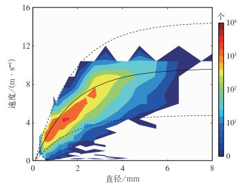 2023年7月12日21:00—22:00经质量控制后雨滴谱仪观测的降水粒子数量、速度与直径的分布如图 12所示,该时段降水粒子直径和速度关系与理论预期一致,粒子数量大值区紧密沿理论曲线分布。粒径为0.5~4 mm的粒子数量最集中,尤其在理论曲线附近,粒子数超4000个,4 mm附近仍高达600个以上。大雨滴的增长主要归因于碰并过程,该机制促使大雨滴吸纳众多小雨滴,导致小雨滴浓度下降。同时,雨滴尺寸增大后,增速趋缓,从而制约了大雨滴数量的急剧增加。在本次降水过程中,大雨滴的数量却异常多,这暗示了大气中水汽含量极为充沛。此外,本时段观测到直径超8 mm的粒子。Beard et al(1986)指出,自然降水粒子直径上限约8 mm,超出此范围可能因表面张力与空气阻力共同作用而破碎,因此,当前超限观测值的真实性尚不确定,可能源于真实粒子或其他因素。