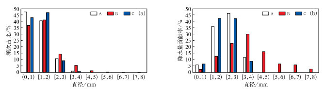 基于费县站在主体对流回波影响前(阶段A:21:01—21:02,雨强0.6 mm·min-1)、强降水超级单体影响期间阶段(阶段B:21:13—21:14,雨强3.2 mm·min-1)和主体回波后侧的尾随层状云区域影响时(阶段C:21:44—21:45,雨强0.2 mm·min-1)三个特定时段,探讨分阶段、不同雨强下降水微物理特征的差异(图 14),各直径区间雨滴粒子对降水量的贡献率及其占比。在阶段A,采样体积内的雨滴粒子数量相对较少(1519个),以直径<2 mm的小雨滴为主,占比高达88.08%。尽管小雨滴占据主导地位,但直径在2~3 mm区间的粒子却对此时的降水量贡献最大,占比达到46.31%。此外,观测到极少的最大雨滴直径(Dmax)为3.7 mm的粒子。对于阶段B,雨强显著增强,采样体积内雨滴粒子数量剧增至4699个,反映出降水粒子浓度大幅提升,该阶段小雨滴(直径<1 mm)占比下降,中到大雨滴占比上升。特别是直径1~2 mm的粒子占比最大,达41.22%,而直径3~4 mm的粒子占比虽不足6%,但成为降水量的最大贡献群体,占30.04%。相对阶段A直径在2~3 mm区间的粒子对降水量贡献最大,出现了粒子直径尺度“升尺度”的特征。值得注意的是,直径>1 mm的雨滴对降水量总贡献率超过97%,且观测到直径>6 mm的特大粒子(Dmax达7.5 mm),特大粒子对降水贡献率达8.81%。可见,经暖雨过程后粒子数浓度与直径同步剧增,高浓度小雨滴通过强碰并过程迅速增长为大粒子,形成宽谱分布,从而显著提升降水效率。在阶段C,粒子数量迅速减少至504个,尽管仍以直径<2 mm的粒子为主(占比90.08%),但2~3 mm的粒子成为降水量最主要的贡献群体(42.14%),与阶段B相比,反映出粒子直径尺度的“降尺度”的现象。C阶段的降水中未见直径>6 mm的粒子,Dmax减小至3.2 mm。综合三个阶段可见,雨强较小时以中、小雨滴为主;雨强增大时,大雨滴数量增多,强降水对应更多的大粒径雨滴,阶段B雨滴直径最大、谱宽最广,因而在短时间内形成极端强降水;而雨滴直径过小则难以形成强降水。