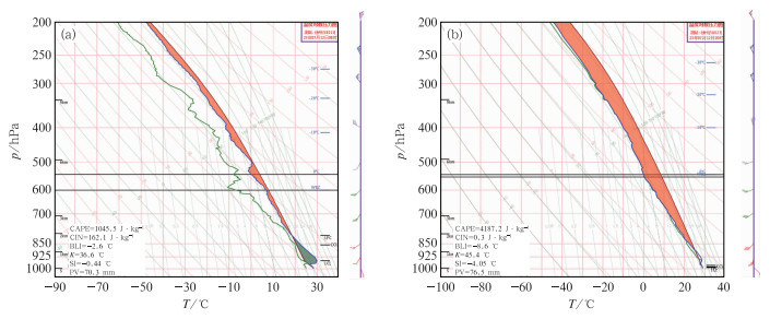 徐州探空资料显示,7月12日08:00极端强降水发生前(图 3a),925 hPa及以下为东南风,其上为西南风,风随高度顺转,暖平流显著,对流有效位能(CAPE)为1045 J·kg-1,对流抑制能量(CIN)为162 J· kg-1,KI指数≥36℃,SI指数≤-0.44℃,大气可降水量(PW)为70.3 mm,暖云层厚度为4756 m。至20:00(图 3b),风场结构未发生显著变化,但热力与不稳定参数等出现剧烈变化,CAPE显著跃增至4187 J·kg-1,CIN接近于零值,KI指数升高至≥45℃,SI指数降低至≤-4℃,自由对流高度低至210 m,PW增大至76.5 mm,暖云层厚度扩展至5114 m,且925 hPa以下温度露点差趋近于零值,表明了大气层结处于极端不稳定状态,极易触发深厚湿对流。