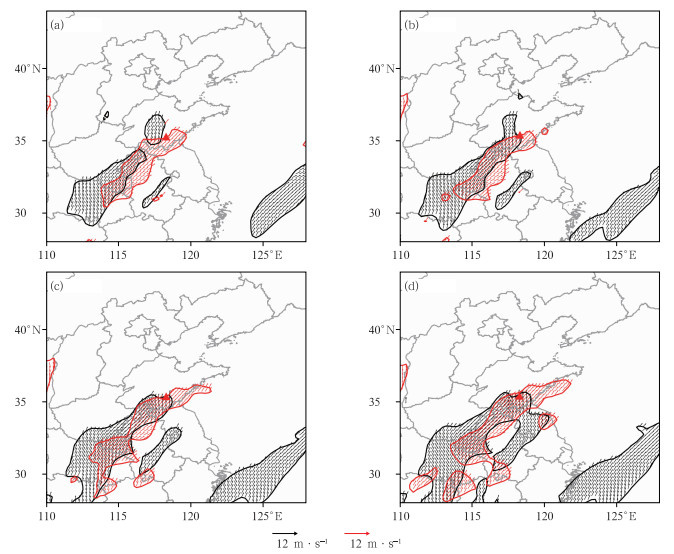图 5 2023年7月12日(a)19:00,(b)20:00,(c)21:00,(d)22:00 700 hPa (红色风矢)、950 hPa(黑色风矢)风速≥12 m·s-1的水平风场 注:红色三角形为费县尚庄站位置,下同。 Fig. 5 Horizontal wind field with wind speed ≥ 12 m·s-1 at 700 hPa (red vector) and 950 hPa (black vector) at (a) 19:00 BT, (b) 20:00 BT, (c) 21:00 BT and (d) 22:00 BT 12 July 2023 |