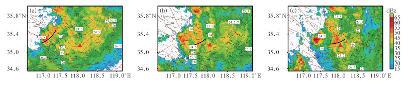 图 7 2023年7月12日(a)19:00,(b)20:00,(c)21:00组合反射率因子(填色)、地面自动站风场(风羽)及气温(红色等值线,单位:℃) 注:黑色实线为地面辐合线。 Fig. 7 Composite reflectivity factor (colored), wind field (barb) and temperature (red contour, unit: ℃) of ground automatic stations at (a) 19:00 BT, (b) 20:00 BT and (c) 21:00 BT 12 July 2023 |