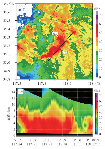 图 8 2023年7月12日21:16(a)临沂多普勒雷达0.5°仰角反射率因子和(b)沿图8a中黑色实线的反射率因子剖面 Fig. 8 (a) Reflectivity factor at 0.5° elevation of Linyi Doppler Radar at 21:16 BT 12 July 2023, and (b) profile of reflectivity factor along the black solid line in Fig. 8a |