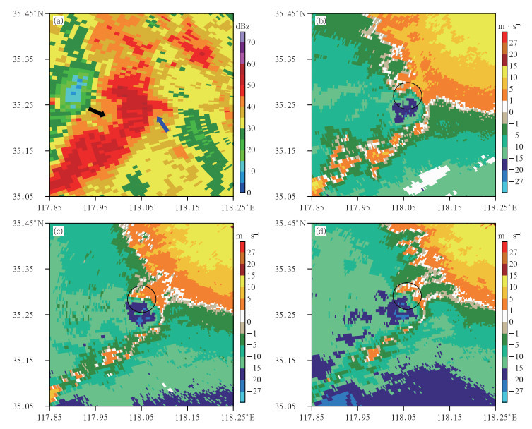 图 9 2023年7月12日21:16临沂多普勒雷达(a)1.5°仰角反射率因子和(b)1.5°、(c)2.4°及(d)3.4°仰角径向速度 注:蓝色箭头为前侧V型缺口,黑色箭头为后侧入流急流,黑色圆圈为中气旋。 Fig. 9 (a) Reflectivity factor at 1.5° elevation, and the radial velocities at (b) 1.5° elevation, (c) 2.4° elevation and (d) 3.4° elevation in Linyi Doppler Radar at 21:16 BT 12 July 2023 |