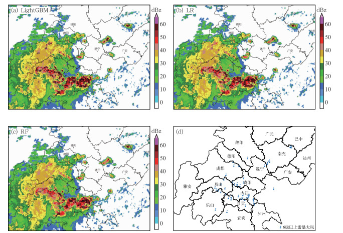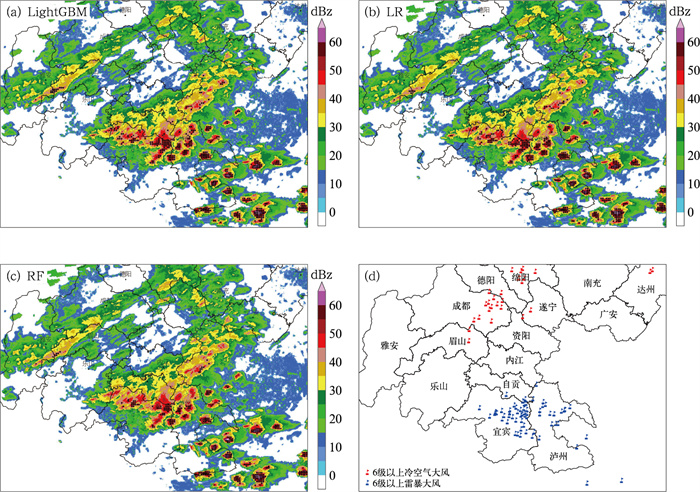 3.3.1 2023年8月12日盆地东部雷暴大风个例(无明显冷空气)2023年8月11—12日,受500 hPa副高外围偏东气流、850 hPa低涡切变及地面弱冷空气共同影响,四川盆地东部出现6~8级雷暴大风。过程自11日22:00持续至12日13:00,由南向北影响除盆地西北部和雅安以外的区域。12日02:30,多单体雷暴位于内江、自贡、宜宾、乐山、眉山一带,并向东北方向移动发展;移动前侧回波强度梯度强盛,并伴有新生对流。图 9d为02:30—03:00 6级以上雷暴大风实况分布,大风主要集中在多单体雷暴前沿和多个分散的单体雷暴中。图 9a~9c分别为Light-GBM、LR和RF模型的雷暴大风预警结果。相比而言,LightGBM预警覆盖范围最广,对应最高的POD和最高的FAR,LR预警格点最少,POD和FAR最低,RF预警范围居中,但综合性能最优,10 km评分半径CSI达0.362,POD达0.617。3种模型均能有效捕捉多单体雷暴前侧及南充、巴中南部的分散雷暴大风,整体预警效果较好。