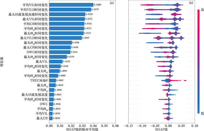 图 11 无明显冷空气影响的雷暴大风预警因子的(a)重要性和(b)SHAP值排名 Fig. 11 (a) Importance and (b) SHAP value rankings of thunderstorm gale warning factors without strong cold air influence |
