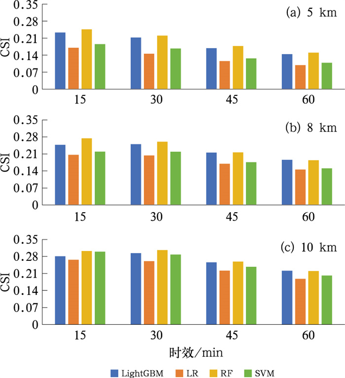 (1) LightGBM模型的POD最高,15 min预警时效下,10 km半径达0.536,表明其捕捉能力最强,但FAR也最高,达0.661,RF的CSI最高,30 min预警时效下,10 km半径达0.306,综合表现最佳。在不同评分半径和预警时效下,CSI和POD评分均随预警时效增加或评分半径减小而显著降低,时效从30 min延至45 min时CSI下降尤为明显。