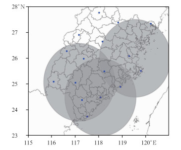 1 数据与方法 1.1 数据来源使用2022年4月至2024年6月福建省福州市、厦门市、龙岩市3部中国新一代天气雷达S波段增强型双线偏振多普勒天气雷达数据,每6 min体扫一次,选取生命周期内始终位于至少2部雷达200 km探测范围(图 1阴影重叠区域)内的对流体作为研究对象,要求其运动轨迹在该区域内持续存在,提取对应时刻组合反射率(CR)和9个仰角(0.5°、1.5°、2.4°、3.4°、4.3°、6.0°、9.9°、14.6°、19.5°)粒子HCL产品,采用模糊逻辑算法(Park et al,2009)对等效反射率因子(Z)、ZDR、径向速度(v)、相关系数(CC)、部分差分相位(PDP)、KDP等6种数据进行判别,得到小雨、大雨、冰雹、大雨滴、晴空回波、地物、干雪、湿雪、冰晶、霰10种粒子分类结果。