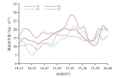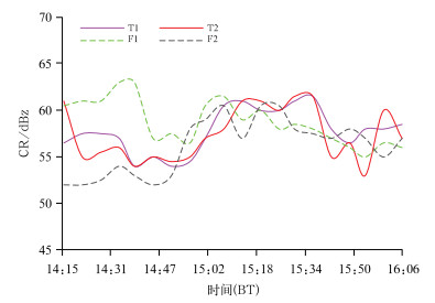 对每个对流体逐个时刻提取雷达CR、液态水含量、回波顶高最大值,绘制相应的时序曲线(图 9~ 图 11)。由图 9可知,4个对流体的CR没有明显区别,在发展旺盛期其CR都达到55 dBz以上。图 10、图 11显示T1的液态水含量、回波顶高比其他3个对流体大,其中回波顶高平均值达11.63 km,最大值接近15.3 km,回波顶高和霰粒子层厚度相同,都在15:30左右开始大幅跃增,15:40左右达到峰值;T2、F1、F2在液态水含量、回波顶高上差异较弱,回波顶高维持在8 km左右(平均值为8.095 km)。而在霰粒子层厚度的时序分布特征上,T1、T2的数值都比较高,平均值分别为2.75 km、1.87 km,最大值分别为5.92 km、3.5 km,而F1、F2平均值分别为1.54 km、1.34 km,最大值分别为1.98 km、1.81 km。对4个对流体的霰粒子层厚度计算差分值(即相邻时刻的变化值),可得T1、T2、F1、F2中差分值大于0 km的时刻占比,分别为63%、67%、62%、47%,有地闪发生的对流体更多时刻的霰粒子层厚度不断增大,且在首次地闪发生前几个时刻,T1、T2霰粒子层厚度变化率都处于增加的状态。因此,在本次个例中,相比于其他常见的雷达产品,霰粒子层厚度在对地闪活动的表征上更具有显著性。