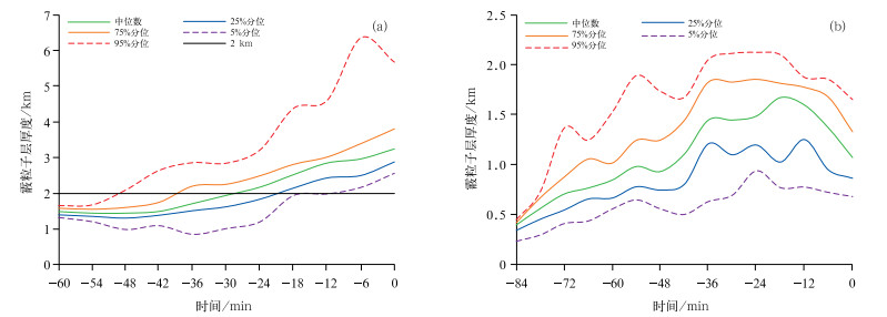 图 3 2022年4月至2024年6月(a)有、(b)无地闪发生霰粒子层厚度样本数据时序分位数曲线 Fig. 3 Time-sequence quantile curves of graupel particle layer thickness (a) with or (b) without cloud-to-ground lightning based on sample data from April 2022 to June 2024 |