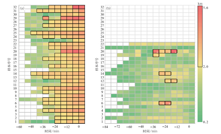 由图 3可知,有地闪发生的对流体样本中,霰粒子层厚度呈现逐步增大的趋势,所有样本出现首次地闪时刻的霰粒子层厚度至少达到2.26 km(样本在零时刻的最小值);在无地闪发生的对流体样本中,霰粒子层厚度随对流体的生命周期增长呈现先增大后减小的趋势,绝大多数(95%分位点)时刻样本霰粒子层厚度都小于2.2 km,最大的霰粒子层厚度也只达到2.5 km。由图 4可知,正样本色块图颜色值明显大于负样本,正、负样本的平均值分别为2.38 km和1.20 km;由于正、负样本在对流体发展过程中霰粒子层厚度都呈现增大趋势,且正、负样本在霰粒子层厚度的数值区间上有一定的差异,因此通过提取一定的霰粒子层厚度阈值,对任意样本属于正、负样本的可能性进行识别,结合所提取霰粒子层厚度阈值在正样本中表现的预报提前时间,实现对对流体未来时刻出现地闪初生的预报。