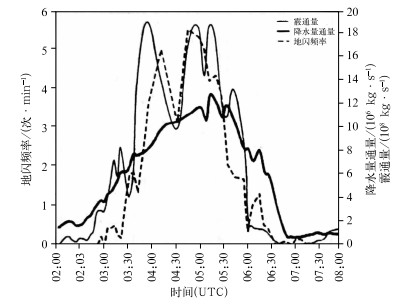 图 6 1995年11月28日02:00—08:00(世界时) Tiwi岛地闪过程地闪频率与降水量通量、霰通量关系(陈渭民,2006) Fig. 6 Relationship between the cloud-to-ground lightning frequency and the precipitation flux and graupel flux during cloud-to-ground lightning process on Tiwi Island from 02:00 UTC to 08:00 UTC 28 November 1995 (Chen, 2006) |