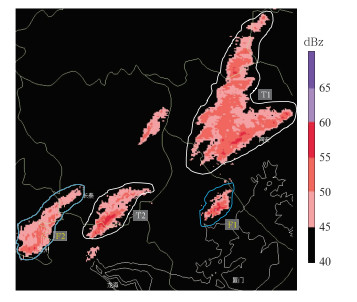 图 7 2022年6月14日14:45福建省南部4个对流体的CR Fig. 7 Composite reflectivity of four convective storms in southern Fujian Province at 14:45 BT 14 June 2022 |