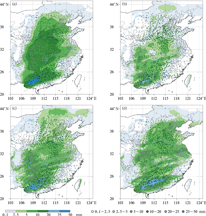 图 10 2025年12月12日08时至13日08时累计降水量实况(圆点)和提前5 d的预报结果(填色)对比 (a)主观预报,(b)智能网格,(c)ECMWF,(d)CMA-GFS Fig. 10 Comparison of observation (dot) and the forecasts (colored) 5 d in advance of the accumulated precipitation from 08:00 BT 12 to 08:00 BT 13 December 2025 (a) subjective forecast, (b) smart grid, (c) ECMWF, (d) CMA-GFS |
