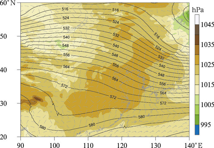 图 12 2025年12月17日500 hPa位势高度(等值线,单位:dagpm)、海平面气压(填色)和10 m风场(风羽) Fig. 12 500 hPa geopotential height (contour, unit: dagpm), sea level pressure (colored) and 10 m wind (barb) on 17 December 2025 |