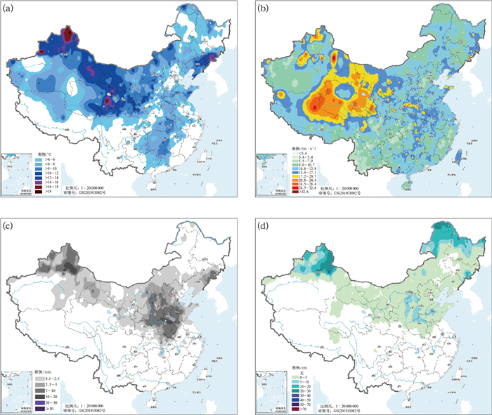 图 6 2025年12月10—13日全国(a)最低气温最大降温幅度,(b)最大阵风风速,(c)累计降雪量和(d)最大积雪深度 Fig. 6 (a) Maximum temperature drop range of the lowest temperature, (b) wind speed of maximum gust, (c) accumulated snowfall and (d) maximum snow depth over China from 10 to 13 December 2025 |