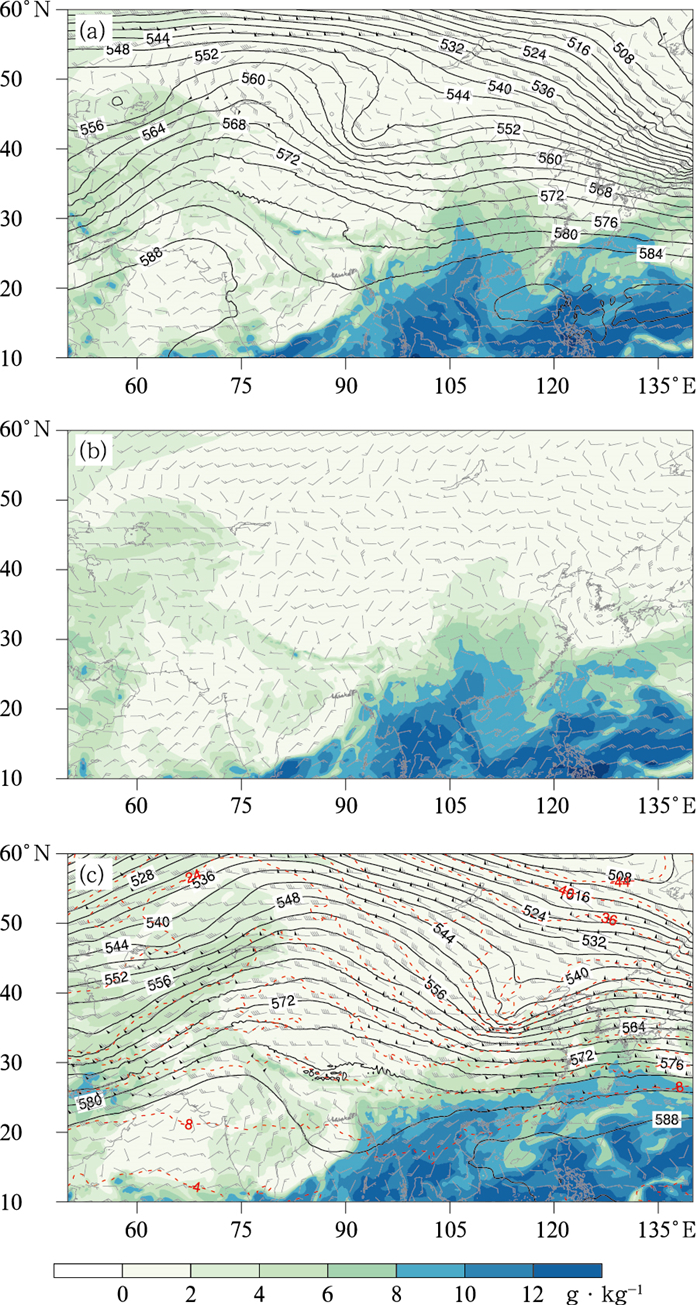 3.1.3 西太平洋副热带高压偏弱、偏东12月,西太平洋副热带高压(以下简称副高)的西伸脊点位于135°E附近(图 4a),位置异常偏东,面积偏小,强度偏弱,中心值较常年同期偏低4~6 dagpm(图 4b),不利于水汽向北输送,将主雨带限制在长江中下游及华南地区(图 1)。但由于亚洲低纬度地区受高度场正距平控制,南支槽较为平直,强度较常年同期偏弱,不利于将孟加拉湾的水汽向我国输送,导致长江中下游地区降水量较常年同期偏少。