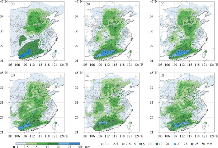 图 9 2025年12月12日08时至13日08时累计降水量实况(圆点)和提前1 d预报结果(填色)对比 (a)主观预报,(b)智能网格,(c)MAIT-V1,(d)ECMWF, (e)NCEP-GFS, (f)CMA-GFS Fig. 9 Comparison of observation (dot) and the forecasts (colored) 1 d in advance of the accumulated precipitation from 08:00 BT 12 to 08:00 BT 13 December 2025 (a) subjective forecast, (b) smart grid, (c) MAIT-V1, (d) ECMWF, (e) NCEP-GFS, (f) CMA-GFS |